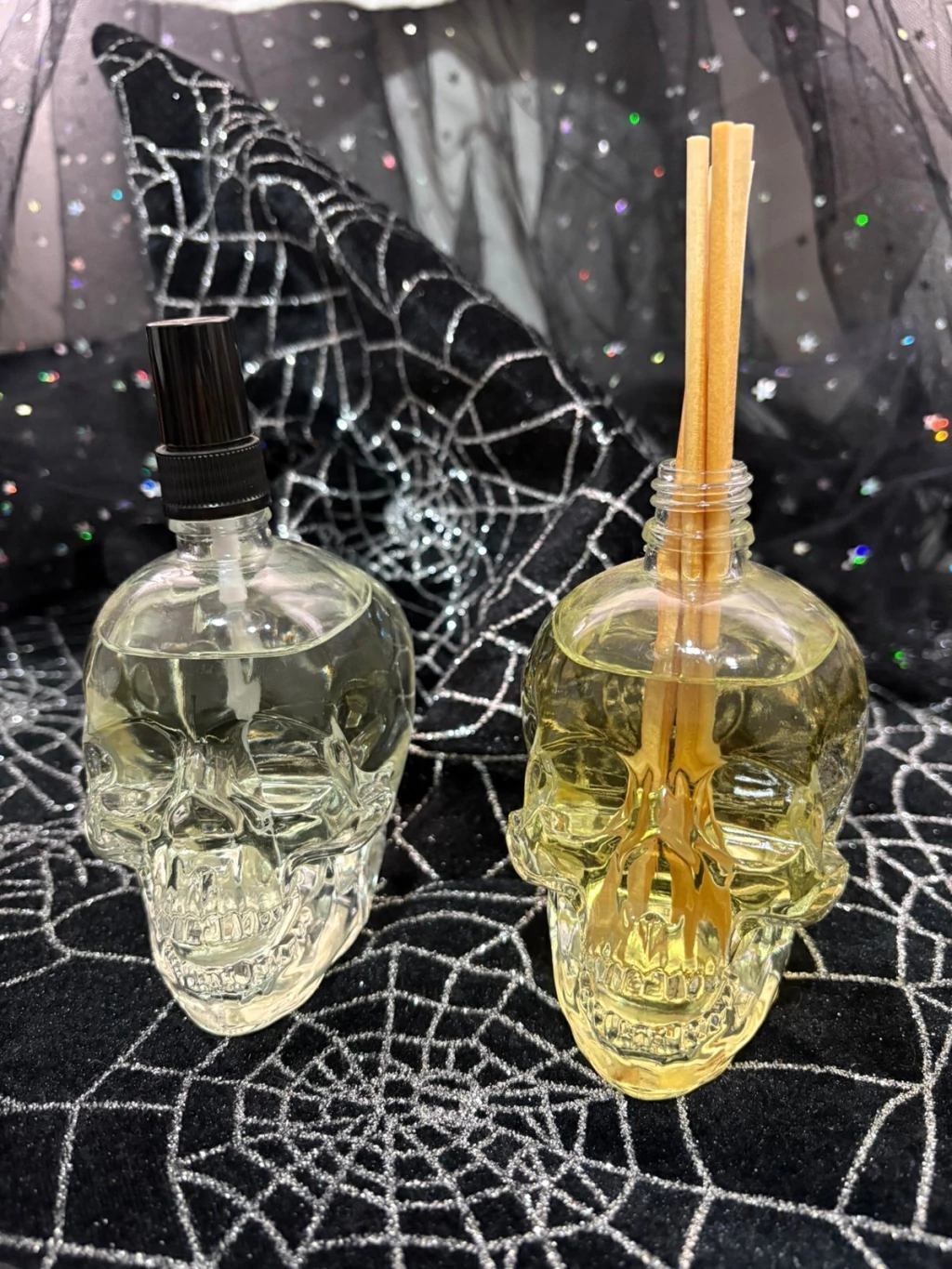 Características do produto: conteúdo líquido em embalagem de vidro, em formato de caveira.